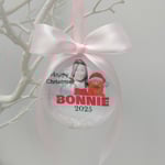 Bauble personalised with name and year (if required)and tied with coloured satin ribbon for hanging