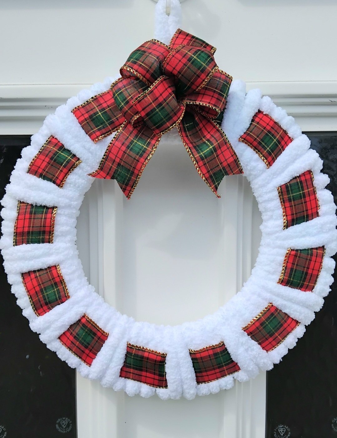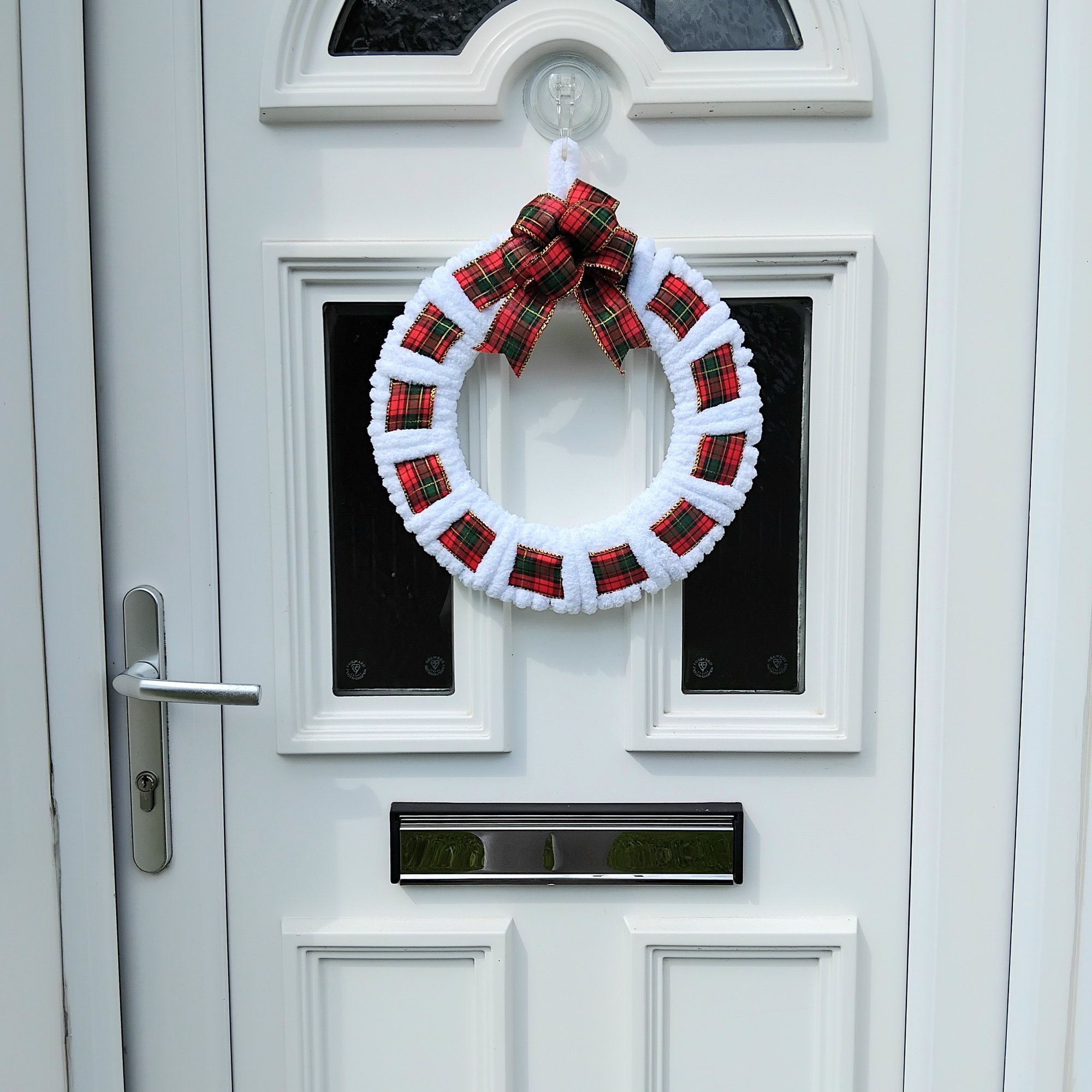 Chunky yarn tartan wreath, can be hung on interior walls/doors or exterior